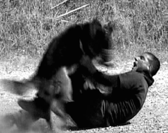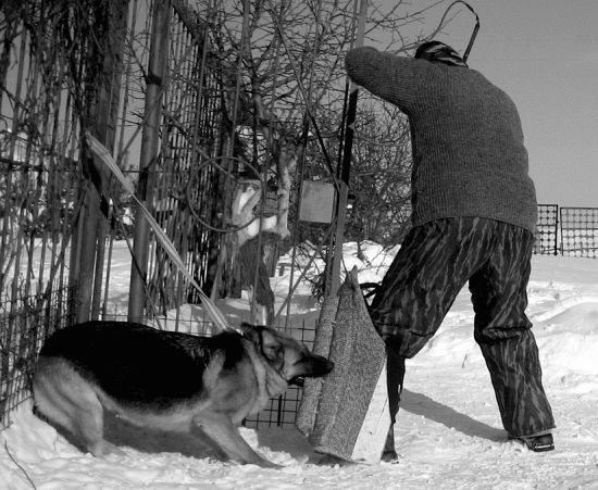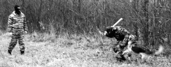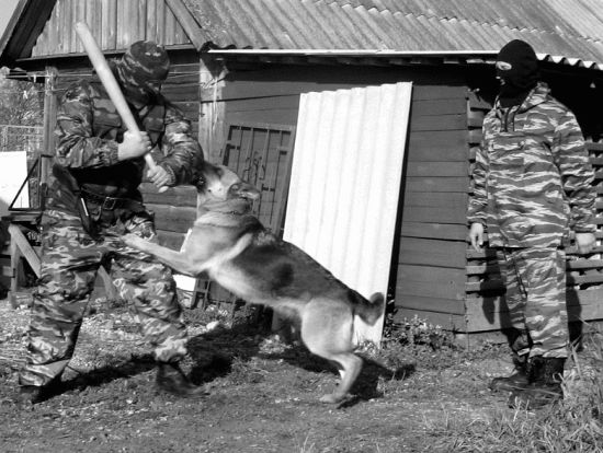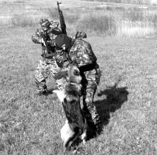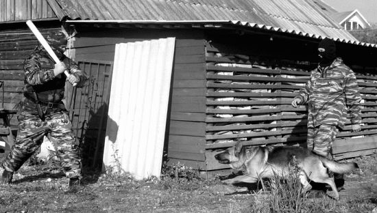 Д. Ф. Методика, несомненно, заслуживает внимания не только для использования в конвойных и пограничных частях, но и в соответствующих антитеррористических подразделениях для самостоятельного поиска и обезвреживания преступников. Есть небольшое замечание, которое сделал С. Н. Бондарев в связи с отработкой данного упражнения. Дело в том, что здесь мы видим типичную мотивацию собаки на средство защиты — дрессировочный костюм, а не на человека. Прятаться и двигаться внутри макета в нем неудобно, поэтому при небольшой коррекции можно достигнуть лучшего результата. Замкнув собаку на человека, мы сможем пускать ее в наморднике для безопасности помощника, который не стеснен средствами защиты и может полностью смоделировать ситуацию в реальной обстановке.