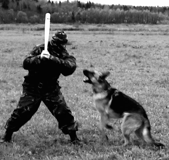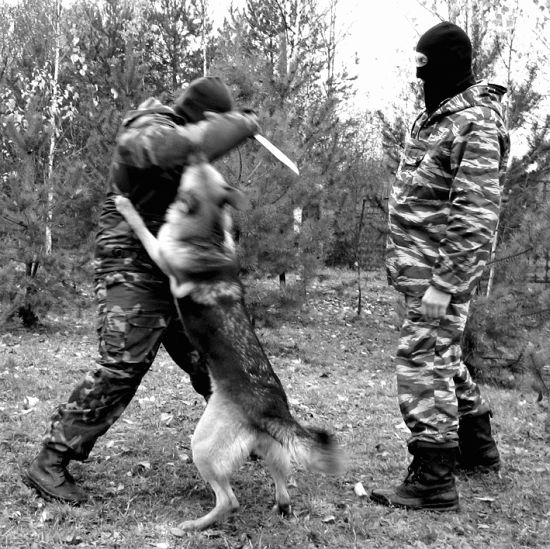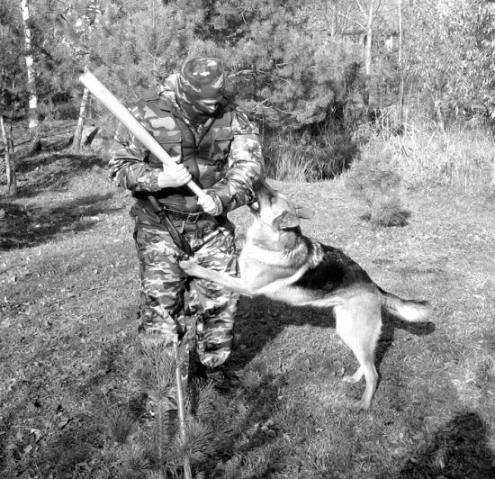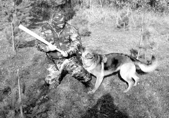 Упражнение 1 Учебная обстановка. На подобранном участке местности помощник в дрессировочном костюме с прутом (хлыстом), тряпкой в руках находится в укрытии. В 7–10 м от него дрессировщики по одному или группой до 4 человек выгуливают собак на коротких поводках. Практические действия. По сигналу руководителя занятия помощник в дрессировочном костюме, энергично размахивая руками, с криком выскакивает из укрытия. Дрессировщик подает собаке команду «ФАС» и, удерживая ее на поводке, устремляется к появившемуся фигуранту. Последний, имитируя испуг, отступает от собаки, двигаясь все время по кругу. Отступая, он энергично отбивается от животного прутом (хлыстом) и тряпкой, периодически вскрикивает как бы от страха и боли, а достигнув своего укрытия, тут же в нем скрывается. В поле зрения собаки помощник находится не более двух минут. Упражнение повторяется через полчаса.Упражнение 2 Учебная обстановка. Время кормления собак. Собаки находятся в вольерах. Перед ними стоят кормушки, рядом, на дорожке, — дрессировщики. Практические действия. По сигналу руководителя помощник в дрессировочном костюме с прутом (хлыстом) и тряпкой в руках с криком выбегает на площадку перед вольерами. Размахивая руками и периодически вскрикивая, он бегает перед собаками, нанося им через решетку удары, имитирует нападение на дрессировщиков, пытается похитить кормушки. В поле зрения собак помощник находится не более двух минут. Упражнение повторяется перед каждым кормлением. Первая задача считается решенной, если собака при виде даже спокойно стоящего человека в дрессировочном костюме неудержимо рвется с поводка в его сторону, а будучи отпущенной, с яростью набрасывается на него.