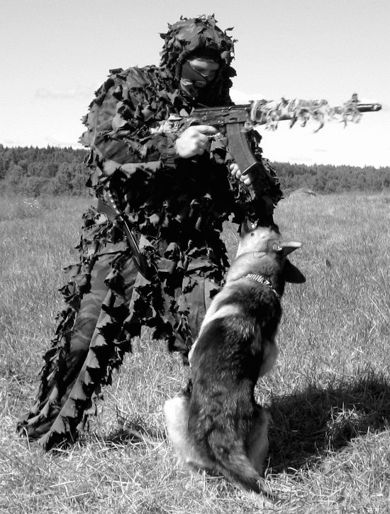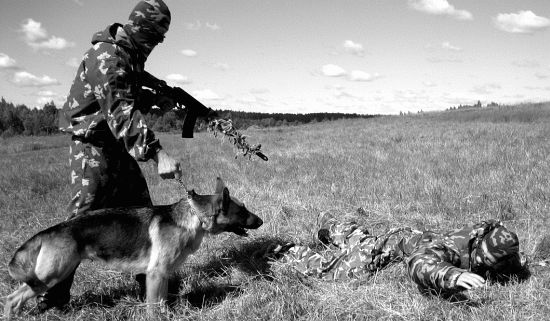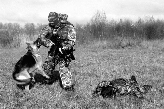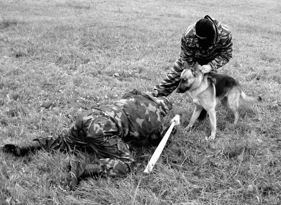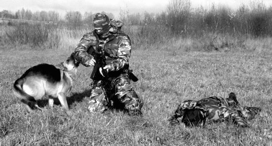 Нарушение условий упражнения: 1. Собака не выполняет какую-либо команду кинолога. 2. Собака приучена по одной отданной команде кинолога осуществлять поиск и при этом, одновременно обнаружив в зоне поиска человека, атаковать его без явных навыков (у собаки) идентификации угрозы и характера поведения обнаруженного человека. 3. Собака не приучена осуществлять обонятельно-поисковую работу в условиях ограниченного пространства в радиусе до 10 м от места расположения кинолога, т. е. собака стремится оторваться от кинолога на расстояние, превышающее 10–15 м от кинолога. Навык необходим, когда рабочие качества собаки используются при проведении поиска только что отстрелявшихся снайперов в населенном пункте и в условиях боевых действий, а также при проведении зачисток в окрестностях населенного пункта и на пересеченной местности с целью обнаружения разведывательной группы и засад противника. Определение результатов: Фиксируется общее время работы группы «К» (от момента первого выстрела до момента, когда группа обнаружит и обезвредит стрелков противника). К общему времени может добавляться штрафное время за нарушение условий упражнения: • непослушание собаки командам (требованиям) кинолога — 5 сек.; • собака не приучена классифицировать и реагировать на различные ситуации, связанные с характером поведения обнаруженного человека, — 10 сек.; • собака не приучена самостоятельно работать по поиску человека в условиях боевой обстановки, не превышая радиус поиска свыше 15 м от места нахождения кинолога, — 15 сек.