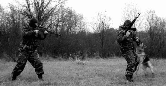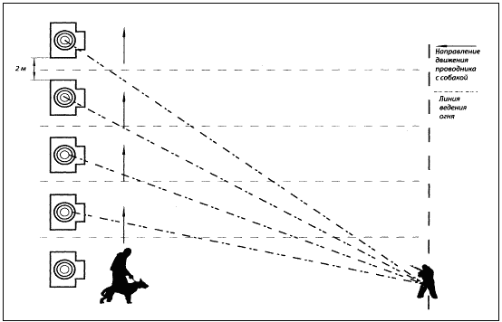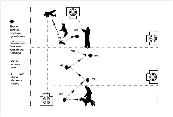 Специальные стрелковые упражнения, указанные ниже по тексту, выполняются по ранее описанным условиям и в такой же последовательности в комплексе со специальными кинологическимиупражнениями.Упражнение № 1 Выполняется из автомата (карабина). место старта на расстоянии приблизительно 215 м от цели; цель: мишень № 4,1 шт., неподвижная; расстояние до цели: 100 м, 70 м, 50 м; количество патронов: 15 шт. Секундомер включается, как только условный «террорист» появится из одного из укрытий и откроет огонь из огнестрельного оружия (холостые патроны). Сотрудник-кинолог с собакой на поводке или без поводка находится на исходном рубеже (отметка «старт»). По условному выстрелу «террориста» сотрудник переводит собаку в боевое состояние (например: команда «СЛУШАЙ»), Как только «террорист» предпримет попытку скрыться с места происшествия путем бегства по фронтальной траектории, кинолог осуществляет пуск собаки на силовое задержание «террориста» по своей команде. Задача «террориста» — пробежать путь от одного укрытия до другого, расстояние составляет около 15–20 м. Место «старта» собаки находится на расстоянии 25–30 м от фронтальной траектории пути «террориста». Задача для штурмовой собаки — не допустить, чтобы «террорист» скрылся во втором укрытии. Собака должна осуществить скоростной рывок по команде в направлении убегающего «террориста» по кратчайшей траектории и выполнить силовое задержание путем активных атакующих действий в отношении «террориста». После задержания «террориста» собака ведет активную борьбу с ним до прибытия кинолога, который, в свою очередь, по своей команде прекращает активные действия собаки и подзывает собаку к себе, «террорист» остается на месте борьбы. В случае, если «террористу» удалось добежать до второго укрытия и спрятаться за дверью, собака должна указать место, где скрывается «террорист», путем пассивного обозначения этого места (посадка, укладка, допускается облаивание) до момента прибытия кинолога к месту работы собаки. После этого кинолог подает команду «террористу» выйти из укрытия и находится в готовности с собакой действовать по обстановке: № 1: «террорист» выбегает из укрытия через дверь и атакует кинолога с собакой, используя разнообразную ударную технику; № 2: «террорист» выбегает из укрытия через окно и убегает; № 3: «террорист» выходит из укрытия и подчиняется командам кинолога.