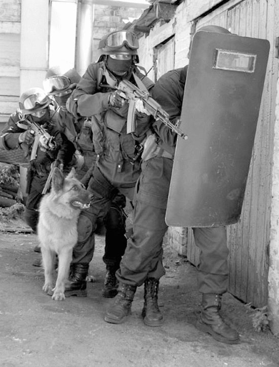 Упражнение № 7 Отдельное специальное кинологическое упражнение для специальных штурмовых собак Условия выполнения — «Преследование, поиск и задержание в условиях штурмовой деятельности»: • макет жилого дома («киллер-хаус»), состоящий из трех ситуационных комнат (оборудованных мишенной обстановкой) с наличием элементов мебели; • помощники («преступники», «заложники») в различных гражданских костюмах — 6 чел., в защитном костюме — 1 чел.; • группа «К» (2 кинолога + 2 собаки), вооружение — пистолеты, оружие не заряжено; • приданная штурмовая группа: 4 стрелка вооружены автоматами, оружие не заряжено, один взрывпакет (имитация светозвуковой гранаты или подрыва двери); • снаряжение для проведения штурмовых мероприятий — бронезащита головы (шлем), бронезащита туловища, средства защиты глаз, суставов и радиостанция; • упражнение № 7 проводится с обеими собаками поочередно. Порядок выполнения упражнения: штурмовая группа (кинолог, собака + 3 стрелка) и группа блокирования (кинолог, собака + 1 стрелок) находятся на месте старта (исходное положение), в 100 м от объекта штурма. По команде судьи группа блокирования (кинолог с собакой без намордника и один стрелок) выдвигается по одному с временным интервалом в указанное место к объекту штурма. Как только группа блокирования займет указанную позицию, штурмовая группа (кинолог, собака в наморднике и 3 стрелка) по радиостанции получает команду на выдвижение к объекту штурма. Выдвинувшись, штурмовая группа размещается под защитой стены и готовится к штурму. На этой позиции штурмовая группа находится 5 мин. По истечении времени судья дает команду на проведение штурма. Один из стрелков (бритчер) готовит проход группы через заблокированные двери. После имитации подрыва дверей (включается таймер) группа входит в помещение, используя один из вариантов тактики, когда собака после подрыва входит первой. Задача для специальной штурмовой собаки включает в себя: Ситуация № 1: идентификация угрозы (вооруженный человек, оказывающий сопротивление) при наличии «заложников» и реакция собаки на угрозу. Ситуация № 2: идентификация «заложников» и реакция собаки на «заложников». Ситуация № 3: идентификация угрозы при наличии «заложников» — преследование, поиск и действие собаки по ситуации в отношении угрозы. Для каждой последующей штурмовой группы последовательность ситуаций в комнатах будет изменяться. Задача для сотрудников (стрелков) штурмовой группы — осуществлять грамотные тактические действия при зачистке помещений. Задача для группы блокирования — осуществить идентификацию человека («заложник», «преступник»), который в определенный момент может выпрыгнуть из здания, и принять меры к его задержанию, используя при необходимости специальную штурмовую собаку. Таймер останавливается, когда командир штурмовой группы по радиостанции сделает доклад судье о выполнении задачи. Навык необходим, когда рабочие качества собаки используются при проведении специальных антитеррористических операций, а также специальных операций по освобождению заложников.