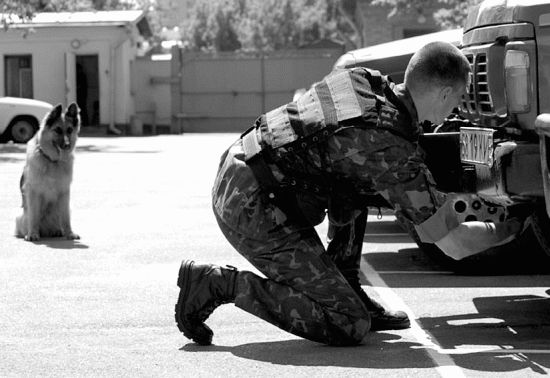 Кинолог с собакой находится перед площадкой, где размещены контрольные автомашины. О своей готовности кинолог докладывает судье, который, в свою очередь, включает секундомер. Специалист-кинолог может управлять собакой, используя голосовые команды и жесты, находясь от собаки на удобном для работы расстоянии, использовать короткий поводок или комбинировать варианты управления. Собака должна уметь осуществить заинтересованный и активный внешний осмотр автомашин. Закладки могут быть установлены (заложены) в местах расположения двигателя (под капотом) или в местах подвески автомашины (днище автомашины). Багажники и салоны (кабины) автомашин не используются для установки или закладки имитационного взрывного устройства. При обнаружении имитационного взрывного устройства собака должна уметь обозначить это место в автомашине своей посадкой или укладкой перед местом, где установлена закладка. Кинолог должен убедиться в положительной работе собаки путем визуального осмотра места, указанного собакой (для этого используются специальные технические средства: досмотровые зеркала или приборы). Если кинолог доверяет собаке, он может контрольного осмотра не делать и оповестить судью об обнаруженной закладке. Судья контролирует время работы собаки и кинолога. Как только кинолог подает сигнал, что второе имитационное взрывное устройство обнаружено, судья останавливает секундомер. Навык необходим, когда рабочие качества собаки используются при проведении: • комплекса оперативно-розыскных мероприятий, направленных на обеспечение безопасности охраняемых лиц в местах их пребывания; • контрольных осмотров транспортных средств при пересечении ими государственной границы в пунктах пропуска (пограничный контроль); • антитеррористических специальных операций и пресечения противоправной деятельности преступных группировок.