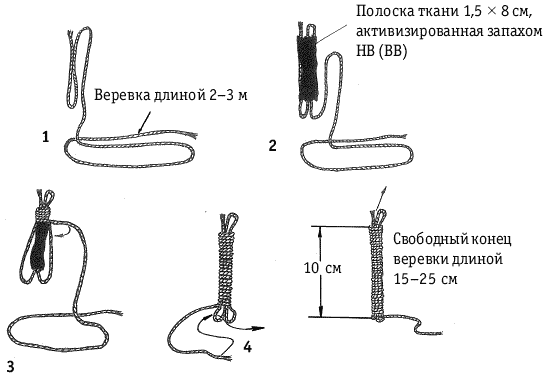1–10 — места стоек манекенов; 3–10 — позиции дрессировщика с собакой, с которых начинается выполнение упражнения; а — металлическая стойка; б — приспособление для хранения стоек; в — способ закрепления одежды на основной стойкеУпражнение № 1 Учебная обстановка. Площадка для подготовки собак к выборке человека и вещи. Все стойки пустые и находятся в крайнем нижнем положении. Дрессировщик с собакой стоит на позиции. Перед ним лежит куртка (рубашка) с запахом основного помощника. Основной и вспомогательный помощники находятся вне площадки, рядом с руководителем занятия. Основной помощник имеет при себе не менее пяти учебных курток (рубашек), впитавших его запах. Практические действия. Дрессировщик поднимает лежащую перед ним куртку (рубашку) и дает ее обнюхать собаке. Затем бросает куртку (рубашку) к первым трем стойкам. Выждав 5–10 сек., он одновременно с командой «АПОРТ» и жестом, указывающим направление движения, посылает собаку за брошенным предметом. Животное должно четко и в полном объеме выполнить прием «апортировка». Для лучшего запоминания собакой запаха основного помощника, исходящего от куртки (рубашки), данный прием повторяется 3–4 раза. Затем дрессировщик, бросив в очередной раз куртку (рубашку) к первым трем стойкам, уводит собаку в вольер. На площадку заходят помощники. Вспомогательный кладет в 40–50 см от лежащей на полу куртки (рубашки) основного помощника свою куртку (рубашку), которая, при необходимости, может быть предварительно опрыснута резко пахнущим раствором. Основной помощник кладет возле позиции небольшой предмет (палку, тряпку и т. п.), впитавший в себя его запах. Закончив работу, помощники уходят. Дрессировщик выводит собаку на третью позицию, сажает ее у левой ноги, поднимает оставленный основным помощником предмет и дает ей его обнюхать. Затем командой «НЮХАЙ, АПОРТ» и жестом, указывая направление движения, посылает собаку к лежащим возле стоек курткам (рубашкам). Собака должна подбежать к стойкам, взять в зубы куртку (рубашку) со знакомым ей уже запахом основного помощника и поднести ее к дрессировщику. Если собака попытается взять вещь вспомогательного помощника, то дрессировщик угрожающим тоном подает команду «ФУ» и следом более мягко — «НЮХАЙ, АПОРТ». Поднесенную собакой куртку (рубашку) основного помощника он тут же забирает, а собаку поощряет. Затем дрессировщик вновь бросает данную куртку (рубашку) в район первых трех стоек, но собаку за ней не посылает, а ставит в вольер. На площадку вновь заходят помощники. Основной помощник по указанию руководителя занятия подправляет брошенную дрессировщиком куртку (рубашку), обновляет запах на предмете. Вспомогательный добавляет к двум уже лежащим возле стоек курткам (рубашкам) еще одну свою. Закончив работу, помощники уходят. На позицию выходит дрессировщик с собакой и повторяет предыдущие действия. Закончив упражнение, он уводит собаку в вольер. Затем на площадке появляются помощники, которые поправляют и меняют местами куртки (рубашки). Основной помощник обновляет запах на предмете, предназначенном собаке для первоначального обнюхивания. Закончив работу, помощники уходят. Дрессировщик вновь выводит собаку на указанную позицию и повторяет с ней предыдущие действия. После каждой такой отработки приема во время нахождения собаки в вольере помощники