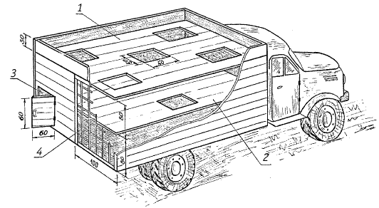 1 — верхний настил с пятью люками; 2 — средний настил с люком; 3 — лаз с дверью; 4 — металлическая решетка с ячейками (15x15 см) Примечания: 1. Люки оборудуют съемными крышками. 2. На каждый люк изготавливается по 6 реек размерами 600x100x20 мм. 3. Для имитации груза применяются палочки диаметром 25–30 мм и длиной 300 мм, ими заполняется весь объем ящика.Вторая задача считается выполненной, если собака по команде дрессировщика «ВПЕРЕД» самостоятельно поднимается по лестнице на эстакаду, по откидному мостику переходит на макет, безбоязненно передвигается по верхнему настилу кузова, смело прыгает во все его люки и лазы.