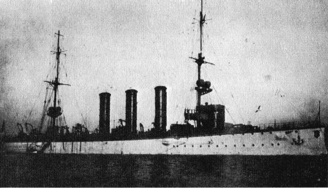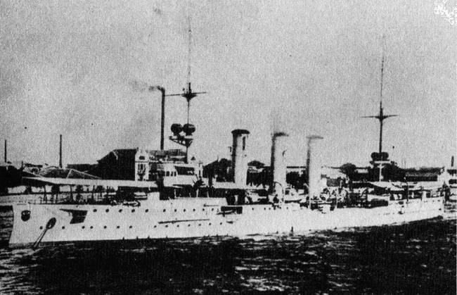 Легкий крейсер «Эмден» вскоре после ухода из Циндао перед самым началом войны.