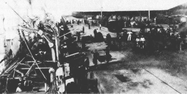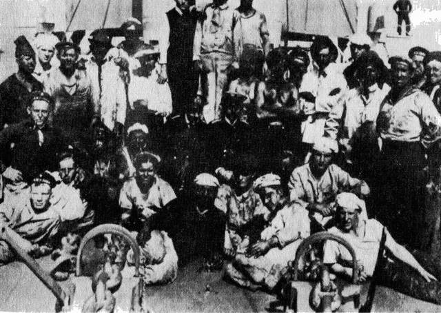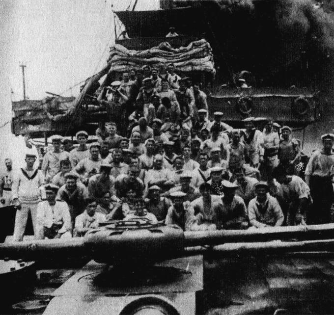 Офицеры и матросы «Эмдена» во время загрузки угля в Циндао. Для загрузки угля разрешалась любая одежда. После каждой загрузки угля корабль тщательно отмывали. Пополнение запасов угля было самой большой трудностью крейсера во время рейдерских операций.