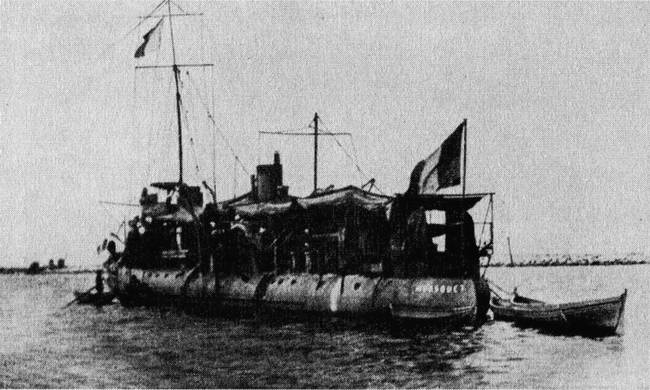 Французский эскадренный торпедоносец «Муске» у Пулау-Пенанга. 28 октября 1914 года, введенный в заблуждение ложной дополнительной трубой «Эмдена», был потоплен с тяжелыми человеческими потерями после короткого артиллерийского обстрела.