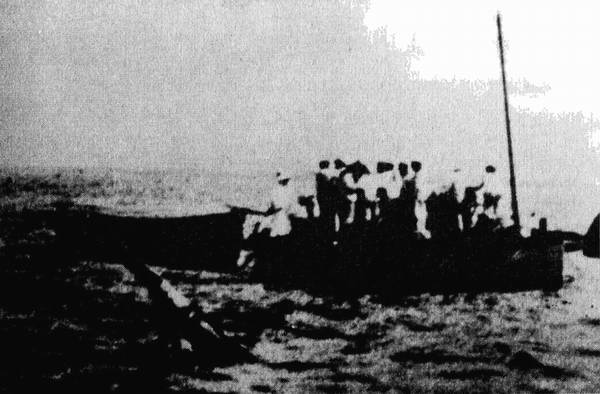 Первая шлюпка с «Сиднея» приближается к севшему на мель «Эмдену» через день после сражения. Выжившие собрались на почерневшей, тлеющей кормовой палубе.
