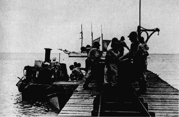 Матросы «Эмдена» загружают шлюпку и паровой катер припасами. На удалении стоит «Айша», на которой другая часть десантного отряда поднимает паруса.