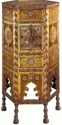 Гравированный и украшенный серебром латунный кургий — столик-ларец для хранения Корана.
