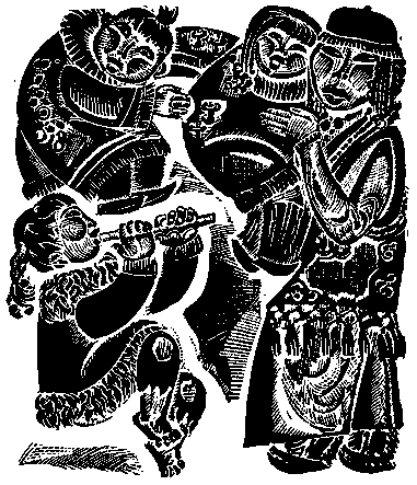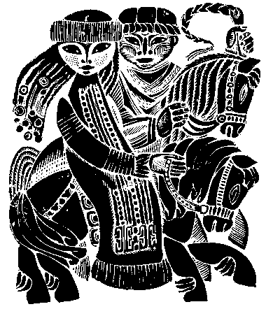 Жила-была девочка, звали ее Торко-Чачак — Шелковая Кисточка. Глаза у нее точно ягоды черемухи, брови — две радуги. В косы вплетены заморские раковины, на шапке кисточка из шелка белого, как лунный свет. Однажды заболел отец Шелковой Кисточки, вот мать и говорит ей: — Сядь, дитя мое, на буланого коня с белой звездочкой на лбу, поскачи на берег бурной реки к берестяному аилу. Там живет Телдекпей-кам[5]. Попроси, позови ею, пусть придет отца твоего вылечит. Девочка вскочила на буланого коня с белой звездочкой на лбу, взяла в правую руку ременный повод с серебряными бляшками, в левую — плеть с узорчатым черенком. Резво бежал длинногривый конь, уздечка подскакивала, как хвост трясогузки, кольца на сбруе весело звенели. Телдекпей-кам отдыхал у порога своего берестяною аила. Острым ножом он резал из куска березы круглую чашку-чочойку. Услыхал резвый топот копыт, звучный перезвон колец на сбруе, поднял голову и увидал девочку на буланом коне. Статно сидела она в высоком седле, полыхала на ветру шелковая кисточка, пели заморские раковины в тугих косах. Нож выпал из руки кама, чочойка в костер покатилась. — Уважаемый дедушка, — молвила девочка, — мой отец заболел, помогите нам. — Я вылечу твоего отца, Шелковая Кисточка, если ты за меня замуж пойдешь. Брови у кама — белый мох, борода — колючий кустарник. Испугалась девочка, хлестнула коня и ускакала. — Завтра на утренней заре жди меня, — крикнул ей вдогонку Телдекпей-кам. Примчалась Шелковая Кисточка на стойбище, в аил вошла. — Что сказал тебе мудрый кам? — спрашивает мать. — Завтра на утренней заре Телдекпей-старик будет здесь. В небе звезды еще не растаяли, в стойбище люди молока еще не заквасили, в котлах мясо еще не сварилось, белую кошму по земле еще не расстелили, как послышался топот копыт, это скакал широкий, как сарлык, черный конь. На коне сидел Телдекпей-кам. Старики навстречу вышли, коня под уздцы взяли, стремя поддержали. Молча, ни на кого не глядя, кам спешился, ни с кем не поздоровавшись, в аил вошел. Следом старики внесли двухпудовую колдовскую шубу, красную колдовскую шапку, кожаный бубен с медными глазами. Шубу положили на белую кошму, бубен повесили на деревянный гвоздь, под бубном зажгли костер из душистых ветвей можжевельника. Весь день, от утренней зари и до вечерней, кам сидел, не поднимая век, не шевелясь, не говоря ни слова. Поздней ночью Телдекпей-кам поднялся, глубоко, до самых бровей надвинул красную колдовскую шапку, с пестрой бахромой стеклянных бус. Два пера, выдернутые из хвоста филина, торчали на шапке, как два уха, красные лоскуты трепыхались, как два крыла. Бусины стучали, звенели, хлестали кама по лбу, по щекам, как крупный град. Кряхтя, поднял кам с белой кошмы свою двухпудовую шубу, охая, просунул руки в жесткие рукава. По бокам шубы висели сплетенные из колдовских трав лягушки и змеи, на спине болтались шкурки дятлов. Снял кам с гвоздя кожаный бубен с медными глазами, ударил в него деревянной колотушкой — загудело, зашумело в аиле, как на горном перевале зимней порой. Люди похолодели от страха. А кам плясал-камлал, бубенцы дребезжали, бубен гремел. Но вот разом все смолкло. В тишине будто гром загрохотал — это в последний раз ухнул бубен и затих. Телдекпей-кам опустился на белую кошму, рукавом отер пот со лба, пальцами расправил спутанную бороду, взял с берестяного подноса серд