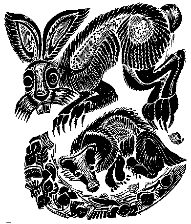 Жил-был барсук. Днем он спал, ночами выходил на охоту. Вот однажды ночью барсук охотился. Не успел он насытиться, а край неба уже посветлел. До солнца в свою нору спешит попасть барсук. Людям не показываясь, прячась от собак, шел он там, где тень гуще, где земля чернее. Подошел барсук к своему жилью. — Хрр… Бррр… — вдруг услышал непонятный шум. «Что такое?» Сон из барсука выскочил, шерсть дыбом встала, сердце чуть ребра не сломило стуком. «Я такого шума никогда не слыхивал…» — Хррр… Фиррлить-фью… Бррр… «Скорей обратно в лес пойду, таких же, как я, когтистых зверей позову: я один тут за всех погибать не согласен». И пошел барсук всех, на Алтае живущих, когтистых зверей на помощь звать. — Ой, у меня в норе страшный гость сидит! Помогите! Спасите! Прибежали звери, ушами к земле приникли — в самом деле от шума земля дрожит: — Брррррк, хрр, фьюу… У всех зверей шерсть дыбом поднялась. — Ну, барсук, это твой дом, ты первый и полезай. Оглянулся барсук — кругом свирепые звери стоят, подгоняют, торопят: — Иди, иди! А сами от страха хвосты поджали. В барсучьем доме было восемь входов, восемь выходов. «Что делать? — думает барсук. — Как быть? Которым входом к себе в дом проникнуть?» — Чего стоишь? — фыркнула росомаха и подняла свою страшную лапу. Медленно, нехотя побрел барсук к самому главному входу. — Хрррр! — вылетело оттуда. Барсук отскочил в испуге, к другому входу-выходу заковылял. — Бррр! Изо всех восьми выходов так и гремит. Принялся барсук девятый ход рыть. Обидно родной дом разрушать, да ослушаться никак нельзя — со всего Алтая самые свирепые звери собрались. — Скорей, скоррей! — приказывают. Горько вздыхая, царапал барсук землю когтистыми передними лапами. Наконец, чуть жив от страха, пробрался в свою высокую спальню. — Хррр, бррр, фррр… Это, развалясь на мягкой постели, громко храпел белый заяц. Звери со смеху на ногах не устояли, покатились по земле: — Заяц! Вот так заяц! Барсук зайца испугался! — Ха-ха-ха! Хо-хо-хо! — От стыда куда теперь спрячешься, барсук? Против зайца какое войско собрал! — Ха-ха-ха! Хо-хо! А барсук головы не поднимает, сам себя бранит: «Почему, шум в своем доме услыхав, сам туда не заглянул? Для чего пошел на весь Алтай кричать?» А заяц знай себе спит-храпит. Рассердился барсук да как пихнет зайца: — Пошел вон! Кто тебе позволил здесь спать? Проснулся заяц — глаза чуть не выскочили! — и волк, и лисица, рысь, росомаха, дикая кошка, даже соболь здесь! «Ну, — думает заяц, — будь что будет!» И вдруг — прыг барсуку в лоб. А со лба, как с холма, — опять скок! — и в кусты. От белого заячьего живота побелел лоб у барсука. От задних заячьих лап прошли белые следы по щекам. Звери еще громче засмеялись: — Ой, барсу-у-ук, какой ты красивый стал! Хо-ха-ха! — К воде подойди, на себя посмотри! Заковылял барсук к лесному озеру, увидал в воде свое отражение и заплакал: «Пойду медведю покажусь». Пришел и говорит: — Кланяюсь вам до земли, дедушка-медведь. Защиты у вас прошу. Сам я этой ночью дома не был, гостей не звал. Громкий храп услыхав, испугался… Скольких зверей обеспокоил, свой дом порушил. Теперь посмотрите, от заячьего белого живота, от заячьих лап — лоб и щеки мои побелели. А виноватый без оглядки убежал. Это дело рассудите. Взглянул медведь на барсука. Отошел подальше — еще раз посмотрел, да как зарычит: — Ты еще жалуешься? Твоя голова раньше черная была, как 