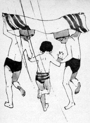 Янка была рыбой, и говорить ей не полагалось. Она только весело поглядывала на маму и папу, которые сидели возле палатки на большой надувной подушке. Зато Данка лопотала как настоящая утка. У неё даже получился стишок: — А я утка, а я утка. Обгоню всех за минутку!