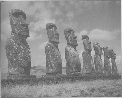 Первыми из европейцев на Пасхе побывали голландские моряки — команды адмирала Роггевена. По их словам, среди островитян были люди с белой, коричневой и бронзово–красной кожей. Жили островитяне в домах из тростника, с виду похожих на перевернутые лодки. Роггевен и члены его команды встретились с теми, кого они приняли за вождей и жрецов, включая группу с более светлой кожей, носивших большие диски в проколотых мочках ушей. Однако больше всего голландских мореплавателей поразили статуи, о которых говорится в корабельном журнале адмирала Роггевена: «Сначала эти каменные лики потрясли нас; мы не могли понять, как островитяне, не имеющие прочных канатов и плотной строительной древесины для изготовления механизмов, тем не менее смогли воздвигнуть статуи высотой не менее девяти метров и при том довольно объемистые». Однако для Роггевена тайна существовала недолго. Он отколол кусок статуи и убедил себя в том, что это была хитроумная подделка, слепленная из глины, а затем покрытая галькой. Осколок суши в Тихом океане оставили в покое почти на полвека, но как только о его существовании стало широко известно, он превратился в своего рода магнит для европейских и американских мореплавателей. В октябре 1770 г. испанский вице–король Перу послал флот специально для того, чтобы найти остров Пасхи. После двухнедельного плавания командующий испанским флотом достиг своей цели. Спустя несколько лет на острове Пасхи появились гости из еще более отдаленных стран. Знаменитый английский мореплаватель, капитан Джеймс Кук, прибыл на остров в марте 1774 г. На сушу высадилась небольшая группа людей, включая Махине, полинезийца с острова Таити, который мог в ограниченных пределах общаться с островитянами, которые жили весьма бедно. Французская экспедиция Лаперуза, достигшая острова Пасхи двадцать лет спустя, никаких следов голода не наблюдала. Французы пришли к выводу, что во время визита Джеймса Кука туземцы, должно быть, прятались в пещерах. Художник экспедиции почему‑то наделил жителей острова Пасхи и их статуи характерными европейскими чертами. К тому времени, когда научное исследование острова Пасхи развернулось полным ходом, живых островитян осталось гораздо меньше, чем огромных каменных статуй. В 1886 г. команда с американского военного корабля «Могикан» выполнила топографическую съемку острова и насчитала 555 статуй. Следующие археологические экспедиции совершили новые открытия. На сегодняшний день на острове насчитывается от 900 до 1000 статуй, или моаи («образов»). Есть сведения о статуях, рухнувших в море, которое постоянно подмывает берега. Высота статуй варьирует от 2 до 11 м, но существует стандартный стиль и форма: длинная человеческая голова и торс, выдающийся подбородок, вытянутые мочки ушей, руки плотно прижаты к бокам, ладони сложены на животе. У некоторых статуй есть глаза из красного и белого камня, а также коралловые или каменные пукао (головной узел) на макушке, которые могут символизировать волосы или красные головные уборы из перьев, упоминаемые моряками. Примерно 230 статуй когда‑то было установлено в вертикальном положении на платформах, от трех до пятнадцати в одном ряду. Некогда существовало от 250 до 300 платформ, и практически все они были расположены вдоль побережья. Все статуи были повернуты лицом внутрь острова, словно гига