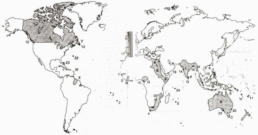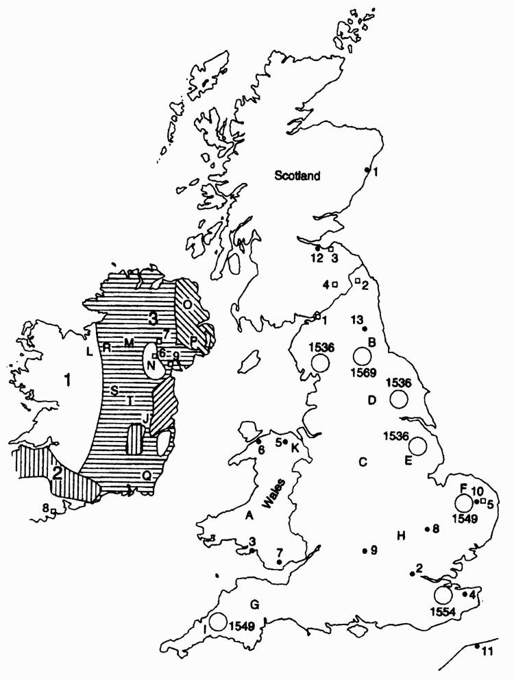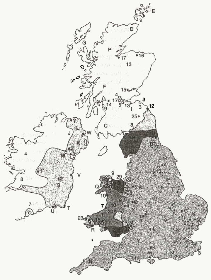 A. Чешир; B. Англси; C. Голуэй; D. Кейтнесс; E. Оркнейские острова; F. Аргайл; G. Западные острова; Н. Йоркшир; I. Лотиан; J. Ольстер; К. Даун; L. Антрим; М. Сассекс; N. Корнуол; О. Сомерсет; Р. Росс; О. Дорсет; R. Норфолк; S. Саффолк; Т. Линкольншир; U. Нортумбрия; V. Кент; W. Гемпшир; X. Херефордшир; Y. Уилтшир; Z. Гламорган; 1. Кередигион; 2. Говер; 3. Лейнстер; 4. Коннахт; 5. Гвинедд; 6. Пемброкшир; 7. Десмонд; 8. Томонл; 9. Поуис; 10. Дехьюбарт; 11. Кидвелли; 12. Гвент; 13. Морей; 14. Клуйд; 15. Дивед;