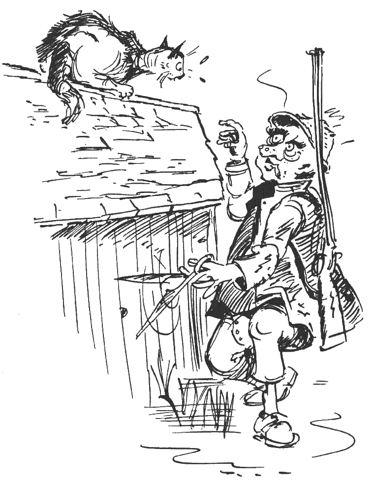 Пришло время продумать все до мелочей. Многие коты погибали из-за того, что отправлялись в путешествие неподготовленными. Самое главное — запастипобольше еды и хорошенько отдохнуть, поднабраться силенок. Этим он и займется. Он размышлял над свалившимися на него заботами, тщательно вылизывая себя, но солнышко так сильно пригревало, что очень скоро Сабрину сморило. Он уснул. Утренние события так утомили Сабрину, что он проснулся только к вечеру, озябший и проголодавшийся. Сколько же времени он спал? К нему, сонному, могла подкрасться утка! А это еще что? На нем лежало нечто незнакомое. Веревка! Веревка — самое неприятное для кота. Ею можно его повязать, лишить свободы. И люди иногда используют эту гадость. Неподалеку виднелась плоскодонка Лодочника. Неужели Лодочник привязал его к капоту трактора? ЛЕЖИ СМИРНО, КОТИК, И НИЧЕГО НЕ ПОЧУВСТВУЕШЬ. О нет, только не это! Кто-то схватил его за лапу. Утка! Спасите! — Кончай свой кошачий концерт! — А? — Это были всего лишь еноты. — Что ВАМ от меня надо? — Он в своем уме, — сообщил Пистоль остальным. — Не сбрендил. Да я и не сомневался, хотя он совсем дряхлый. У котов, как и у енотов, крепкая голова. — Он заглянул Сабрине в глаза: — Мы похожи, верно? Какое нахальство! Уподобить кота какому-то еноту! Сабрина дернулся, пытаясь подняться и наподдать этому наглецу. И наподдал бы, но, к несчастью, запутался в веревке еще больше и, молотя лапами, скатился на землю. Веревка держала надежно. Она обмоталась вокруг задних лап, не давая двигаться. Еноты, обессилев от хохота, катались по земле, дрыгая конечностями. Сейчас они бы стали легкой добычей для хищников, окажись хоть один поблизости. К сожалению, хищники не появились. Зато веревка еще плотнее обхватила его тело, стянула живот, дернулась и вдруг приподняла его зад над землей. Енотов это зрелище привело в восторг. Сабрина судорожно извивался, когтил воздух, но высвободиться не мог. Из-за тракторного колеса заскакала катушка, и подхваченный ветром воздушный змей взмыл в вечернее небо. Сабрина бежал за ним через двор на передних лапах, в то время как задние беспомощно висели в воздухе. Какой позор и унижение! Это конец. Когда он выпутается из этого, если вообще выпутается, уйдет в холмы, отыщет там, в пустыне, уединенную пещеру и всю оставшуюся жизнь, которая, надо надеяться, будет короткой, будет питаться ягодами и мышами. Там, в одиночестве и безопасной удаленности от людей и насмешников зверей, он будет размышлять о смысле жизни. Великие мысли посетят его. Он проникнет в Тайны Жизни. Откроет самые важные секреты бытия: почему, например, луна в безветренные ночи ныряет в бобровые пруды? Или отчего птичье гуано падает всегда точно на кошачью голову? Ну и все такое прочее. И мир уже никогда не узнает, какого мыслителя он потерял. Пистоль отпраздновал позор кота фейерверком, выдернув провод от тракторной батареи и дотронувшись им до капота. А пока Сабрину несло к дальним прудам, к тракторной вспышке добавились гулкие звуки ружейных выстрелов. Казалось, ад явился на землю. Нет, здесь, в этом диком мире, нет места для цивилизованного кота.