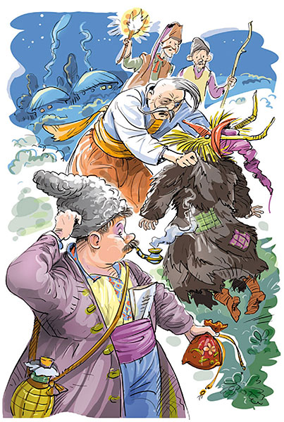 — А что до этого дьявола в вывороченном тулупе, то его, в пример другим, заковать в кандалы и наказать примерно. Пусть знают, что значит власть! От кого же и голова поставлен, как не от царя? Потом доберёмся и до других хлопцев: я не забыл, как проклятые сорванцы вогнали в огород стадо свиней, переевших мою капусту и огурцы; я не забыл, как чёртовы дети отказалися вымолотить моё жито; я не забыл… Но провались они, мне нужно непременно узнать, какая это шельма в вывороченном тулупе.