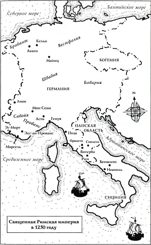 Фридрих II, которого короновал один из предыдущих пап (короновать императора мог только папа), был титулярным правителем тех остатков Римской империи, которые именовались «Священной» и «Римской», хотя фактически не были ни тем, ни другим. Основными составляющими его империи были королевство Германия, монархи которой звались «королями римлян» (хотя жили отнюдь не вблизи от Рима), и королевство Сицилия, унаследованное Фридрихом от матери-сицилийки. Реально Сицилия вообще не была частью Священной Римской империи, но для Фридриха это было несущественно, поскольку он не намеревался отказываться от нее. Соответственно, в качестве императора Фридрих II также заявлял свои права на титул короля Римского (хотя позднее он передал это почетное звание своему старшему сыну) и короля Сицилии. В довершение путаницы Фридриха также считали правителем Иерусалима: это право он приобрел, побывав в крестовом походе лет за десять до того, но с тех пор ни разу туда не возвращался и никак не контролировал ситуацию в Святой Земле.