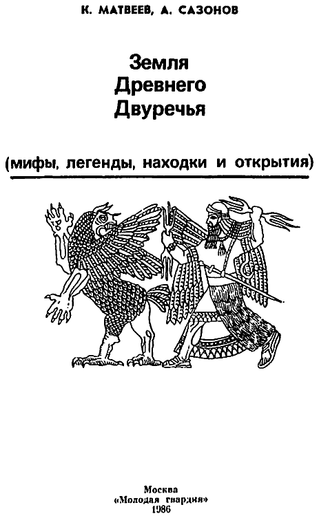 Наш юный читатель! Приглашаем вместе с нами совершить путешествие по следам древних цивилизаций, поражавших своим величием, красотой и богатством современников, населявших территорию между Тигром и Евфратом. Древние жители этой страны называли ее Домом двух рек — Бих-Нахрейн, древние греки — Месопотамией, а русские — Междуречьем или Двуречьем. На территории между двумя реками возникли и затем исчезли с лица земли государства Шумер, Аккад, Вавилония и Ассирия. Эти государства сформировали цивилизацию, которая наряду с египетской, индийской и китайской оказала огромное влияние на общечеловеческую культуру. Цивилизация Двуречья имела непосредственное и интенсивное влияние на Кавказ, Переднюю Азию, Грецию и через последнюю на европейские народы. И с этой точки зрения нам интересно узнать, где и как оно прослеживается в нашей современной жизни, по каким направлениям оно шло, какую роль сыграло. Понимая важность этой проблемы, мы выделили специальный раздел нашей книги о наследии Ассирии и Вавилонии. Очень большое влияние оказала культура Двуречья и на составителей Библии. Сторонники ее в наше время пытаются доказать, что Библия — «богодуховна», «богосотворенна» и что она — от всевышнего и ниспослана людям с небес. Авторы приводят ряд мифов шумерского и ассиро-вавилонского происхождения и исторические факты, которые помогают читателю понять, что тексты Библии имеют земное происхождение и перекликаются с мифами и легендами народов, живших, в частности, в Двуречье, в Шумере. Шумер был расположен к югу от современной столицы Ирака Багдада до Нижнего моря, как назывался тогда Персидский залив. В эту часть Двуречья в IV тысячелетии до н. э. стали проникать народы, получившие название шумеров, и селиться рядом с другими народами, которым за отсутствие имени дали название протошумеров, или дошумеров. Здесь в период около III тысячелетия до н. э. постепенно складывались города-государства. Среди них прежде всего отметим города-государства Эриду, Лагаш, Ур, Киш и другие. Это были уже классовые рабовладельческие государства, которые вели между собой постоянные войны за гегемонию в Шумере. Период становления этих и других более мелких городов-государств в Шумере в науке называется раннединастическим шумерским периодом. К северу от Шумера проживали семитские народы. Они и внешне и по языку отличались от шумеров. Если шумеры была безбородыми и безусыми, то семиты были с длинными курчавыми бородами и волосами, ниспадающими до плеч. И язык их отличался от шумерского коренным образом. Он похож на современный ассирийский, древнееврейский и арабский, а шумерский, по утверждению ряда ученых, не имеет генетических связей с другими языками мира. Между шумерами и семитами не было мира, они часто воевали за преобладание в Двуречье. Об этом свидетельствуют завоевания царя-семита Саргона I (Аккадского), правившего 55 лет. О нем мы будем говорить подробно в соответствующей главе нашей книги. Здесь же отметим, что Саргон I начал свои завоевания с города-государства Киша (ныне Тель-Ухаймир) — северного города Шумера, разгромил его и стал практически правителем северного Двуречья. Позже он завоевал весь Шумер. Саргон I в отличие от других правителей создал новую столицу на пустом месте и назвал ее Аккадом. От имени города Аккада и пошло название всего го