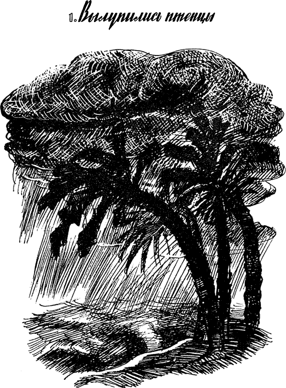 В тот день, когда вылупился из яйца Карроинги, ревел и бушевал ветер; песок, поднятый вихрем с земли, походил на высокие башни; порывы ветра ломали хрупкие ветки смоковницы; море бросало на берег свои брызги, а воющий шквал прибивал к самой земле траву. Высиживал птенцов отец, во всяком случае большую часть времени. Старый Бэрамул понимал всю важность этого дела и только вначале разрешал матери делить с ним долг высиживания четырнадцати оливково-зелёных яиц, собранных в одном месте. Все яйца были правильной овальной формы, и острые концы их глядели в одну сторону. Для страусов это было радостное зрелище — ровный круг из яиц, лежащих на траве в гнезде из веток. Яйцам всё время нужно было тепло. Потому-то, наверное, Бэрамул так ревниво оберегал их. Во всяком случае, уже вскоре после того, как Кундэллу, мать-эму, положила последнее яйцо, Бэрамул начал проявлять признаки беспокойства. Ночью он обегал вокруг гнезда, издавая глубокие гортанные крики и громко хлопая крыльями, затем возвращался неспеша назад, прогонял Кундэллу из гнезда и занимал её место. Когда первый птенец пробил зелёную скорлупу, Бэрамул был явно очень взволнован и возбуждён. Он бил крыльями, сражаясь с сильными порывами ветра, и Кундэллу приходилось держаться на почтительном расстоянии от его когтей. Затем эму-отец снова сел на яйца, укрыв дрожащего птенца от сильного ветра своими взъерошенными перьями. Только что вылупившийся птенец совсем не походил на своих родителей. Шея у него была короткая, а всё тело забавно покрывали коричневые и белые пятна. Хвоста у него не было. Когда ветер стих, Бэрамул накормил новорождённого Карроинги травой и семенами, которые можно было достать, не вставая с гнезда. Карроинги ел жадно. Как будто он знал, что вот-вот и второй птенец пробьёт себе дорогу сквозь яичную скорлупу, а за ним ещё и ещё один, и скоро вся пищащая семья станет громко требовать еды.