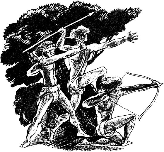 С дерева опять раздался клич эму, которому превосходно научились подражать чёрные люди. Бэрамул ещё шагнул вперёд, вытянув шею и напряжённо оглядываясь по сторонам. И вот он под самым деревом. Сильный и ловкий человек с неистово бьющимся сердцем изо всех сил бросает острое копьё, и Бэрамул падает, пронзённый им. Он бьётся на земле, хлопая крыльями и громко крича, стучит по земле ногами, поднимая целые тучи пыли и травы. О горе!.. Поражённые эму отступают назад. Но теперь ни один из чёрных людей не спешит убивать их. Тот, что бросил копьё, дрожит от радости, но остаётся спрятанным в ветвях дерева. Что ещё он задумал? Отбежав недалеко, эму останавливаются и оглядываются назад. Они не понимают поведения Бэрамула, который всё старается подняться на ноги и не может. Эму начинают возвращаться. Один из них вырывается вперёд, останавливается, опять бежит вперёд, желая узнать, почему у Бэрамула так странно взъерошены крылья и почему он перестал дышать. Тут летит ещё одна стрела, и любопытную птицу постигает та же участь, что и Бэрамула.