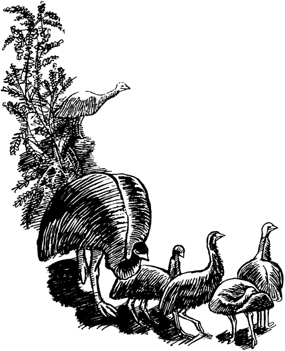Когда снова пришло лето, эму объединились в стаю и все вместе бродили по холмистым равнинам. На этот раз им не удалось воспользоваться ежегодным урожаем инжира. Но там было много другой еды. Правда, иногда эму глотали и то, что едва ли можно было назвать едой, например металлические болты или гвозди, случайно обронённые землемерами или дорожными рабочими. Такие штуки, конечно, не переваривались и оставались у эму в желудке, но, как видно, не причиняли им зла. И вот однажды Карроинги сделал настоящее открытие. Полный восторга, он поспешил скорее сообщить о нём всей стае. Эму последовали за ним через многие мили[3] ветренного пространства, пока Карроинги не остановился перед маленьким деревом с узкими, длинными листьями. На фоне листьев ярко выделялись красные плоды около дюйма[4] в окружности. Кундэллу насторожилась: фрукты могли оказаться ядовитыми. Но кое-кто из голодных молодых эму уже принялся срывать их с дерева. Кундэллу сама тоже попробовала один. Снаружи он оказался сочным и мягким, но внутри была большая морщинистая круглая косточка. Предстоял выбор: то ли совсем отказаться от плодов, то ли глотать их вместе с косточкой. Кундэллу предпочла глотать их с косточкой. А молодые эму уже и сами решили прибавить квондонг к своему и без того обильному меню и с удовольствием продолжали рвать плоды с соседних деревьев. После того, как Карроинги открыл квондонг, он стал очень популярен в стае. Его начали уважать даже старшие эму: они считали, что он подаёт большие надежды. Чёрных людей эму больше не встречали — те ушли далеко на север. Но стали появляться белые люди — они возделывали землю и повсюду пасли свои стада овец. Как-то утром вожак стаи, сильный, крепко сбитый самец, наскочил на двух белых людей, рубивших высокое красное дерево. Несколько недель спустя Карроинги своими глазами увидел группу белых людей, строивших железную дорогу. Люди только смотрели на птиц, иногда прогоняли их, но не делали попыток поймать их. Так продолжалось в течение трёх лет. Эму жили спокойно, а Карроинги тем временем из подростка превратился в великолепную взрослую птицу. Голова его возвышалась на уровне пяти футов и даже выше и сидела на длинной и гладкой шее, покрытой голубой кожей. Глаза у него были удивительно большие, светло-карие, с тёмными зрачками. На его чёрном, твёрдом, слегка загнутом клюве виднелись большие ноздри. Его ноги были сильны и красивы; до колен они были без перьев, их покрывало что-то вроде чешуи. Из трёх пальцев на ноге средний был самым длинным, толстым, выдающимся вперёд, с острым, крючковатым когтем. Но лучшим украшением Карроинги был пышный покров из перьев, шевелящихся на ветру. На спине вдоль позвоночника перья распадались на две части и мягко спускались направо и налево. На широкой спине перья были чёрные, с едва заметным блеском, на нижней части шеи они неожиданно переходили в серые и даже белые, а по бокам спускались пёстрые, бронзово-коричневые перья с чёрными и светло-кремовыми пятнами. Когда ветер поднимал верхний покров, взору открывался толстый слой причудливо завитых перьев, похожих на старые, пожелтевшие кружева.