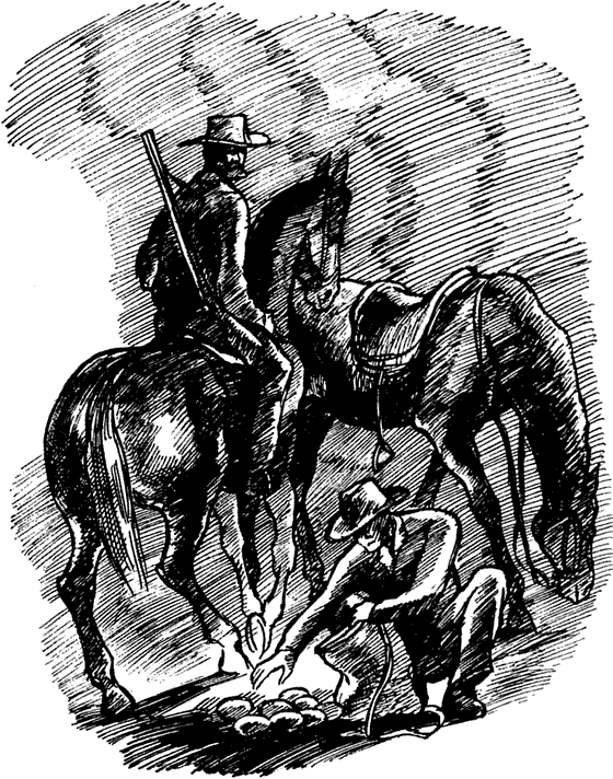 Стук копыт быстро приближался. Одна лошадь или две? Зимний день кончался. Белый туман повис над землёй, и тёмные силуэты ближних дубков, искривлённые и сучковатые, казались как бы выгравированными на светлом фоне неба. Далеко впереди равнина незаметно сливалась со взметнувшейся вверх громадой серых облаков. Каждый нерв, каждый мускул Карроинги был напряжён. Он всё ещё надеялся, что стук копыт вдруг начнёт удаляться. Но нет! Он приближался прямо к нему. Карроинги в страхе прижался к земле. Когда лошадиное цоканье раздалось всего в нескольких ярдах от него, сердце его отчаянно заколотилось. С пронзительным криком вскочил он на ноги и бросился бежать. Двое людей натянули поводья, чтобы успокоить испугавшихся лошадей. — Вот гнездо, Билл! — Посмотри-ка на чудака, спасающего свою жизнь! — Ну и кладка! Карроинги остановился в сорока ярдах от людей и беспокойно оглядывался назад. Пока один из всадников следил за ним, другой соскочил с гнедой лошади и быстро сложил в сумку из-под сахара все яйца.