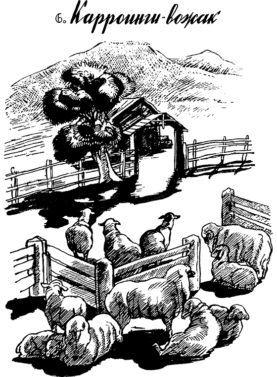 Так Карроинги потерял отца. Среди убитых эму были ещё две его сестры и два брата. Когда стая увидела, сколько из её числа убито коварными людьми, все решили, что пора менять пастбище. И они покинули приморскую равнину с сочной травой. Никогда уж больше не придётся им лакомиться круглыми плодами фиговых деревьев, так как те росли только на побережье. На своих длинных, неуклюжих ногах эму покрыли всю бесконечную широкую равнину и добрались наконец до гор. Некоторые из них протоптали себе тропу сквозь каменистые ущелья, усеянные родниками и заросшие пёстрыми папоротниковыми деревьями, лаврами и кедровым лесом. Здесь было хорошо и передохнуть, поесть ягод и выпить холодной, освежающей воды из прозрачного источника. Но жить постоянно здесь было нельзя: неровность почвы, постоянные сумерки и ледяной ветер, пронизывающий ущелье, заставляли эму спешить всё дальше и дальше. Они взбирались по склонам до высоких бесплодных вершин и там пробивали себе дорогу вдоль острых хребтов, больно ушибаясь и раня при этом о твёрдые камни ноги. Но вот после долгих недель пути они очутились на заросшем травой плато, вдали от своего прежнего пастбища.