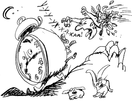 где мы познакомимся с некоторыми героями нашего повествования. Сколько ни старайся, но точного времени нам все равно не узнать, зато, если мы склонны поддаваться страхам, можно ужасаться всласть«Жил да был, не тужил, за горами, за долами, за дремучими лесами, за чудесными землями, под голубыми небесами, так далеко и давно, что не упомнить все равно, что не увидеть никому, разве что месяцу одному…» — напевал себе под нос некто, бредя по змеящейся среди бугорков и кочек тропинке. Путник остановился и взглянул на небо: ему было любопытно, какую мину скорчит месяц, заслышав, что на земле его поминают. Но месяц лишь заулыбался во весь свой круглый лик — доброе слово всякому приятно, — засиял еще ярче, заливая все окрест серебристым потоком, светлее даже средь бела дня не бывает. — Ну, у тебя и рожа — на сыр похожа! — пренебрежительно бросил путник и побрел дальше по извилистой тропке, вновь затянув свою незамысловатую песенку: — Жил-был то ли он, то ль она, то ли месяц, то ль луна… — дерзкий взгляд его был по-прежнему устремлен в небеса, как вдруг… ТР-РАХ! Всему виной был корень, пересекавший тропинку. Путник зазевался и, споткнувшись, грохнулся наземь. — Тик-так, тик-так, — жалобно зачастил он, поднимаясь на ноги и ощупывая, все ли у него на месте. — Зачем ты вредничаешь? — обрушился он на сияющее светило. — Не понравилось, что с головкой сыра тебя сравнил? Это надо же додуматься: отвлек мое внимание и подсунул под ноги толстенное корневище! Ни стыда у тебя, ни совести! И рожа глупая да круглая, головка сыра — один к одному! Месяц помрачнел, засовестился. — Обижайся — не обижайся, плевать я хотел на твои обиды! У меня вон маленькая стрелка погнулась! — И пострадавший принялся бережно выпрямлять стрелку. Да-да, путник, что брел по извилистой тропинке средь бугров и кочек и пререкался с ясным месяцем, оказался часами — старомодным круглым будильником в медном корпусе. Стрелки — тонкие, длинные, с заостренными концами — тоже были медные. На спине винт с широкими лопастями наподобие пропеллера, чтобы заводить механизм. Наверху красовался блестящий полу шар — оттуда и шел трезвон, когда наступала пора кого-нибудь будить. Спереди, на бледно-кремовом циферблате, выделялись тщательно нанесенные — в цвет меди — цифры, от 1 до 12, все до единой, без пропусков, никаких тебе черточек взамен цифр, никаких электронных обозначений: уважающий себя солидный будильник подобных вольностей на дух не принимал. Ежели судьба сводила его с новомодными собратьями, он презрительно фыркал, а то и вовсе отбивал звоночком дразнилку: «Бедолага ты, дружок, твоя техника не в прок, батарейка — не душа, она стоит два гроша, электроники сыны, ваши дни уж сочтены. Вот так-то!» — очень нравилось Будильнику сочинять песенки и мурлыкать их себе под нос. Но сейчас, надутый-недовольный, сидел он на корневище и выправлял часовую стрелку. Закончив дело, поднялся, чтобы продолжить путь, как вдруг… — У-У-У-УХ-ХА-ХАА!