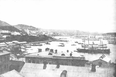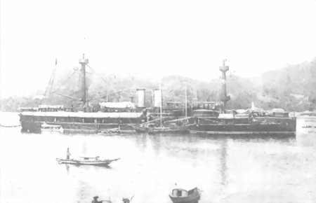Береговая батарея в Амое; на заднем плане — фрегат «Владимир Мономах» РГАВМФ. Ф. 417. Оп. 1. Д. 318. Л. 62Б/5 Однако И.А. Шестакову достаточно было одного признания. «Весьма секретным» письмом военному министру, от 10 июля 1887 года, управляющий обосновал целесообразность, при разрыве с Англией, «для нанесения ей огромного вещественного вреда и тяжкого нравственного поражения», разгрома «ее морских станций в дальних морях — в особенности двух важнейших: Гонконга и Сингапура». Их, а также конечный пункт Канадской железной дороги, адмирал предлагал брать атакой с суши и, «не овладевая прочно», разорять с уничтожением оборонительных средств. Повторив прозвучавшую в рапорте А.А. Корнилова мысль, И.А. Шестаков писал, что подобный метод, используемый и «против богатых портов Австралии, достаточно уже изученных нами … даже при недостаточном успехе облегчит задачи наших крейсеров в океане, заставив неприятеля держать суда свои в ближайшем соседстве портов». Он обещал: «Если Военное министерство изъявит готовность заранее сосредоточить в Владивостоке, под благовидным предлогом, десантный отряд в 2 — 3000 чел. и вверить его Начальнику Тихоокеанской эскадры, то Морское министерство озаботится приобретением быстроходных транспортов, должным образом приспособленных, изучит с точностью необходимые пункты, выработает, при участии представителя Военного ведомства, подробные планы действий и своевременно выставит для прикрытия десанта достаточную морскую силу»[723].
