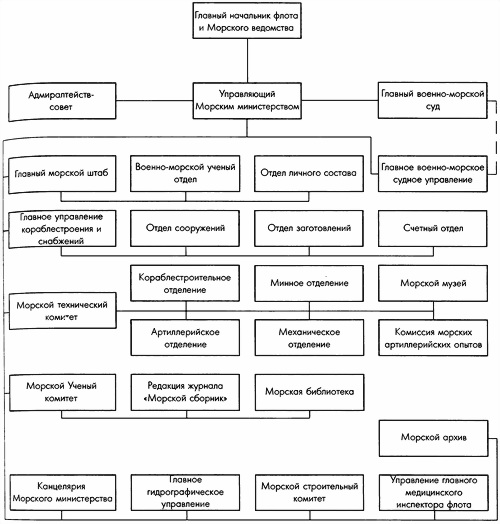 К началу 1880-х годов, согласно действовавшему с 1 января 1867 года Положению, на вершине должностной пирамиды российских военно-морских сил находился 53-летний главный начальник флота и Морского ведомства, генерал-адмирал великий князь Константин Николаевич, родной брат и ближайший помощник императора Александра II. Человек достаточно широко образованный, Константин Николаевич, по справедливому замечанию А.П. Шевырева, не отличался вместе с тем глубиной суждений. По отношению ко флоту это вызывалось недостаточной морской практикой и малым опытом командования судами и соединениями. Неуравновешенный и несдержанный характер, а также чрезмерно увлекающийся ум часто мешали ему достигать поставленных целей. Занимая с 1862 года должность наместника в Царстве Польском, а с 1865 года — председателя Государственного совета, великий князь сохранил за собой лишь общий надзор за делами ведомства, доверив непосредственное руководство им управляющему Морским министерством[35]. Действительный автор Положения 1867 года, 66-летний генерал-адъютант Н.К. Краббе, управлявший министерством с 1860 по 1875 год, сумел сосредоточить в своих руках значительную власть. Умный, но посредственно знакомый с морским делом Н.К. Краббе сделал карьеру благодаря адъютантству у светлейшего князя А.С. Меньшикова и был скорее царедворцем, чем флотоводцем, однако не утратил способности выслушивать, понимать и поддерживать талантливых изобретателей. В значительной мере благодаря этому российский флот сумел избежать полной зависимости от иностранцев в области броненосного судостроения и производства стальных орудий, одним из первых приступил к опытам в подводном плавании, стал осваивать минное дело. Однако стремление угодить великому князю и самому императору часто заставляло Н.К. Краббе чрезмерно усердствовать в исполнении их пожеланий, закрывая глаза на сравнительно низкую эффективность недостаточно испытанных образцов нового оружия, что не соответствовало интересам флота и государства в целом.