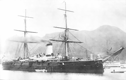 Крейсер «Европа», на котором С.С. Лесовский прибыл в Японию В декабре 1880 года, ожидая ратификации цинским правительством Петербургского договора, еще не избавившийся от костылей С.С. Лесовский и формально замещавший его О.Р. Штакельберг на всякий случай приняли меры для обеспечения эскадры всем необходимым. Начальник морских сил провел секретные переговоры с шанхайским торговым домом «Мелчерс и К°» о снабжении российских кораблей в японских портах[150]. Стараниями К.В. Струве и О.Р. Штакельберга удалось заручиться выгодными условиями нейтралитета Японии в возможной войне России с Китаем[151]. Их задача облегчалась тем, что несмотря на казалось бы состоявшееся в начале 1881 года соглашение между Токио и Пекином о разделе островов Рюкю, отношения двух государств оставались прохладными, и Петербург мог рассчитывать на доброжелательную позицию Японии. Свое расположение японцы демонстрировали 21 января 1881 года, во время аудиенции у микадо контр-адмирала О.Р. Штакельберга со штабом и командирами кораблей, затем во время осмотра японскими моряками российских судов на Иокогамском рейде 29 января. Но особенно оно проявилось во время приема в столице адмирала С.С. Лесовского, который после ратификации 3 мая китайцами Петербургского договора готовился к возвращению на родину. 25 мая бывший начальник морских сил пришел на «Европе» из Нагасаки в Иокогаму, где его встретил морской министр адмирал Кавамура. Оттуда С.С. Лесовский отправился в Токио и 26 мая нанес визиты князьям императорского дома, министрам и иностранным дипломатическим представителям. 3 июня состоялась аудиенция у микадо, а на следующий день в честь почетного гостя был дан парад войск токийского гарнизона и прощальный обед[152]. Без сомнения, такие проводы объясняются не только официальным статусом С.С. Лесовского или воспоминаниями о его плавании к берегам Японии на фрегате «Диана» в 1854 году, о чем на прощальном обеде говорил Кавамура, но и внешнеполитической ситуацией. По окончании чествования, адмирал 7 июня отплыл на «Европе» в Гонконг. Уходил в прошлое Кульджинский кризис, преподавший российскому правительству и, в частности, Морскому министерству несколько уроков. Прежде всего, он выявил слабость сухопутных сил, дислоцированных вдоль границ Китая, особенно на Дальнем Востоке. Исправить сложившееся положение было трудно, главным образом потому, что малонаселенные области Восточной Сибири с трудом могли обеспечить продовольствием и резервами даже расквартированные там в мирное время части. Их личный состав, вооружение, боеприпасы приходилось доставлять морем из Одессы и Кронштадта, что обходилось достаточно дорого и требовало времени, драгоценного в случае внезапного обострения отношений с соседями. К тому же, крайне растянутые морские коммуникации оказались бы весьма уязвимыми, особенно при столкновении с Англией. Обычный состав отряда судов в Тихом океане, не превышавший к началу 1880-х годов трех-пяти крейсеров, не позволял эффективно действовать против Китая. С началом кризиса его пришлось увеличить и довести до 12 кораблей, включая два броненосных, к которым присоединились три корабля Сибирской флотилии и пароход Добровольного флота «Москва»[153]. Однако сосредоточение их на театре завершилось осенью, и лишь благодаря неподготовленности китайцев это промедле