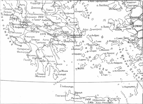 Карта Эгейского моря, Архипелага и острова Крит Н.К. Гирс же полагал, что присутствие наших судов в Эгейском море не должно иметь того враждебного характера против греков, которого (так! — Авт.) принимает Англия»[623]. Управляющий Морским министерством склонялся к мысли задержать отряд Н.И. Казнакова в Смирне. Узнав об этом, Н.К.Гирс испросил высочайшее разрешение направить его в Суду, где находились эскадры держав, а затем «в один из ближайших к Пирею портов, соединенных телеграфом с Афинами, как например в Сиру»[624]. В Суде Н.И. Казнаков должен был войти в сношение с адмиралами, уклоняясь при этом от совместных акций и объяснений по поводу своих намерений. Дальнейшие его действия обуславливались соглашением с Е.К. Бюцовым. На основании этих положений была составлена инструкция командующему отрядом, изложенная в письме Н.М. Чихачева от 24 января 1886 года. Указывая на готовность Англии и Италии силой «не допускать греческий флот до военных действий», начальник ГМШ в соответствии с пожеланиями Н.К. Гирса предписал Н.И. Казнакову, дождавшись известий о прибытии в Архипелаг германского броненосца, отправиться в Суду и заявить, что ему «поручено заботиться о предупреждении военных действийна море», уклоняясь от «объяснений относительно способов, коих Вы намерены держаться… так и от всякого вооруженного действия совместно с другими эскадрами. Относительно же действий миролюбивых, — гласила инструкция, — старайтесь, насколько возможно, достигнуть соглашения с начальниками эскадр австрийской и германской»[625]. Далее Н.М. Чихачев разъяснял, что «правительство наше не имеет по настоящее время намерения вступать в какие бы то ни было военные действия, а желает лишь произвести нравственное давление на греческий народ, чтобы оградить его от увлечений и от опасности, угрожающей ему со стороны европейских морских держав и Турции». Н.И. Казнаков должен был выбрать «район весьма ограниченный, не удаляясь от Афин» и находиться в готовности «по первому приказанию перейти с фрегатом в Пирей». Последнее требование вызывалось опасениями за жизнь греческой королевской семьи в случае беспорядков в Афинах. Письмо было отправлено с лейтенантом А.А. Эбергардом, выехавшим из Петербурга 24 января. 28 января он отплыл из Одессы на пароходе РОПиТ «Лазарев» и вскоре вручил пакет Н.И. Казнакову в Смирне. 4 февраля адмирал покинул порт с «Дмитрием Донским» и «Пластуном», а 7 февраля вошел в Судскую бухту, где «застал английскую эскадру адмирала, лорда Джона Хея, итальянскую эскадру вице-адмирала Мартини и австрийскую коммодора барона Шпауна». Кроме того, в бухте стояли четыре турецких корабля адмирала Хусейна-паши. После установленных визитов адмиралам и генерал-губернатору Савассу-паше, Н.И. Казнаков узнал от Л.А. Няги, что часть жителей Крита ожидала его прихода «чтобы возмутители спокойствия не имели возможности указывать на отсутствие русских в этой демонстрации как на глухую… поддержку греков в их затеях на острове, сами же коноводы ждали нашего прибытия для того, чтобы явиться ко всем адмиралам с депутацией, которая намеревалась поднести письменную петицию о присоединении острова к Греции». В ответ командующий отрядом «просил его объявить, что я… не приму никакой депутации и никаких заявлений»[626]. На следующий день Д. Хэй сообщил Н.И. Казнакову, что испо