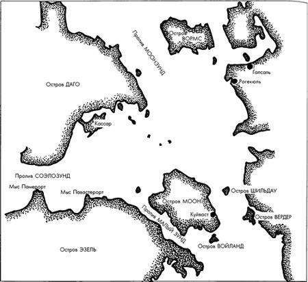 Карта Моонзундского архипелага В результате прений точка зрения Н.Н. Обручева одержала верх, и совещание, признав Моонзунд выгодной стратегической позицией, выбрало для размещения военного порта Либаву. Через четыре дня многие его участники вновь собрались, чтобы рассмотреть представление Министерства путей сообщения в Комитет министров, от 25 августа, в котором предпринималась очередная попытка добиться положительного решения виндавского вопроса. Формулируя свое мнение, генералы и Н.М. Чихачев снова высказались в пользу Либавы[806].