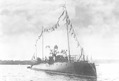 Миноносец «Свеаборг», построенный в Гавре фирмой Норманна Встал вопрос и о привлечении к охране промыслов на Командорских островах клиперов, крейсировавших с 1875 года у берегов Чукотки. Однако вплоть до начала 1890-х годов он так и не был решен, и клипера, основной задачей которых являлось предотвращение незаконной торговли иностранцев с местными жителями и убоя китов в территориальных водах России, определенных инструкций на этот счет не имели[655]. Из Сан-Франциско И.А. Шестаков отправился в Чикаго, а затем в Нью-Йорк, где был встречен поверенным в делах. Р.Р. Розеном. 16 сентября адмирал принял известных американских судостроителей В.Г. Уэбба и У. Крампа, предлагавших свои услуги, а на следующий день осмотрел крейсер «Атланта». 19 сентября он отплыл из Нью-Йорка в Гавр на пароходе «Гасконь» французской трансатлантической компании, увозя с собой составленный фирмой У. Крампа проект 17-узлового крейсера и проект «динамитного судна», вооруженного пневматическими орудиями конструкции Э. Залинского. На борту «Гаскони» управляющий вернулся к отчету о поездке, в котором старался «убедить перенести центр тяжести нашей политики в Азию, и там устроить против ненавистной Англии грозный союз» с Китаем и Японией[656]. Спустя девять дней пароход был в Гавре, где И.А. Шестакова ждали Е.И. Алексеев, С.О. Макаров и командиры миноносцев, выстроенных фирмой Нормана. Нанес ему визит и сам заводчик, а затем и представитель фирмы «Форж э Шантье», предложивший осмотреть строившийся для Японии крейсер, но усталость заставила адмирала отказаться от осмотра и сразу выехать в Париж. После визитов официальным лицам, управляющий телеграфировал в Петербург просьбу позволить ему отдохнуть во Франции, на что получил разрешение Александра III. Но покоем И.А. Шестаков наслаждался меньше недели и, едва к нему вернулись силы, стал ездить на заводы и верфи, познакомился с занявшим в конце 1885 года пост морского министра контр-адмиралом Обом, о реформах которого уже знал из донесений Е.И.Алексеева, приславшего в Петербург книгу Г. Шарма «Реформа флота», воспринимавшуюся в качестве программы нового министра. С первых же дней Об учредил в составе своего министерства особое бюро для заведования минной частью, под руководством контр-адмирала Лайэрле, с отделениями в Шербуре, Бресте и Тулоне, приостановил строительство броненосцев и поставил вопрос о закладке быстроходных легких крейсеров и миноносцев. Им была намечена серия минных опытов и маневров[657]. По собственному признанию министра, он намеревался подготовить французский флот к крейсерской войне, с беспощадным истреблением неприятельских судов вместе с экипажами и пассажирами, так как «война есть отрицание всякого права»[658]. Некоторые положения теории Оба нашли у И.А. Шестакова живой отклик. В начале октября 1886 года, побывав на предприятиях в Сен-Назере, где строился корпус крейсера «Адмирал Корнилов», Нанте, где изготавливались его машины и котлы, в Гавре, на артиллерийском заводе фирмы «Форж э Шантье», получив множество предложений от представителей различных компаний, управляющий выехал в Россию. Однако в Петербурге ему сразу же пришлось заняться безотлагательными делами, в первую очередь связанными с беспокоившим его Болгарским кризисом.