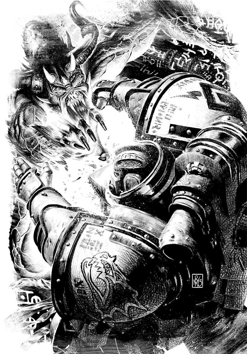 Бьорн сплюнул кровь на бегу и врезался в ряд пустых ящиков, раскидав их по полу. Инстинктивно Волк уклонился вправо, едва избежав урагана снарядов, проревевшего над опущенным плечом. Космодесантник добрался до относительного укрытия — обломков грузового подъемника — и бросился в тень искореженной кабины. Враг последовал за ним, раздавив останки пятерых мертвых Космических Волков. Его тяжелые ноги глухо лязгали о палубу, огромный когтистый кулак вращался, а дымящаяся штурмовая пушка щелкала, когда очередной магазин отправлялся в камору. «Контемптор», — уныло подумал Бьорн. — Это будет очень короткий абордаж». Огромный дредноут громыхал вслед за ним с беспощадной уверенностью ищущего добычу гигантского ящера. Две кормовые трубы выбрасывали маслянистый дым, а шасси боевой машины гудело, фыркало и шипело, давя обломки. Присевший за шатким укрытием Бьорн за один удар сердца оценил свои шансы. Выбор сделан. Он выскочил и помчался прочь, несмотря на то, что штурмовая пушка «Контемптора» снова открыла огонь, разрывая в клочья обломки. Вскочив на один из полуразрушенных захватов подъемника, прежде чем того оторвало, Бьорн оказался достаточно высоко, чтобы увидеть светящиеся глаза дредноута, уставившиеся на него. — Хьолда! — заревел Космический Волк, почти засмеявшись от абсурдности своего плана, а затем прыгнул. Очередь штурмовой пушки прошла мимо, и воин врезался в плечо «Контемптора». Уцепившись за торс машины, Бьорн взмахнул потрескивающим топором и вонзил его глубоко в бронированный колпак. Дредноут неистово развернулся, почти сбросив с себя легионера. Бьорн вскарабкался повыше, увернувшись от вращающегося силового кулака, и нанес сильный удар в шлем врага, затем еще один, колотя по нему обрубком руки. Незавершенный механический протез быстро пришел в негодность, но Волк смог расколоть один из раскосых окуляров и довольно зарычал. «Контемптор» снова крутанулся. Несущий Кровь вырвался из его корпуса. Бьорн отлетел, кувыркаясь в воздухе, на три метра и рухнул на пол, едва удержав в руке топор. Легионер обернулся и уставился прямо в стволы штурмовой пушки. — Скитхоф! — вызывающе заревел Бьорн и приготовился к потоку снарядов, твердо решив встретить смерть с открытыми глазами. Но затем дредноут слева накрыла очередь масс-реактивных болтерных снарядов, высекая искры на броне и окутав ее колышущейся завесой мини-разрывов. Из-за этого стволы штурмовой пушки дернулись в сторону, и снаряды разорвались в метре от лежащего Бьорна. — Фенрис! — разнесся яростный боевой клич Богобоя. — Фенрис фаэрир морд! Трое воинов стаи бросились к «Контемптору», осыпая его градом болтерного огня. Бьорн вскочил, убравшись из-под прицела все еще стреляющей штурмовой пушки, и швырнул топор в поврежденную голову дредноута. Оружие устремилось к цели, но «Контемптор» уклонился. Несущий Кровь вонзился в верхний панцирь, не причинив особого ущерба. Бьорн выхватил болт-пистолет и присоединился к стрельбе, перебегая от одного укрытия к другому. Ангар наполнился интенсивным грохотом болтеров. Четверо Волков опустошили свои магазины по цели, окутав ее вспышками разрывов. Дредноут продолжат наступать. Воины нанесли ему повреждения, но он не останавливался, преодолевая огненный шторм, для чего и был предназначен. Штурмовая пушка развернулась смертоносной 