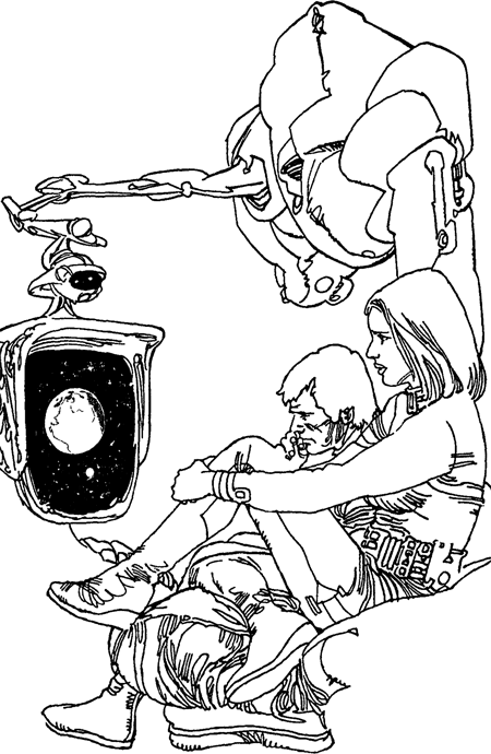 Первой и главной проблемой стал вопрос общения. Хауэллу хотелось как можно скорее научиться понимать новых друзей, чьи жесты и улыбки, без всякого сомнения, выражали радушие и гостеприимство. Неожиданно земляне обнаружили в себе актерские задатки: не имея возможности объясниться словами, они рисовали картинки, жестикулировали, дополняя движения мимикой и сменой интонаций. В результате их беседы с новыми союзниками оказывались даже более информативными, чем можно было себе представить. Мужчины низкорослого племени, некоторые из которых едва доходили Хауэллу до плеча, оживленно расселись вокруг него, чтобы обменяться мнениями по поводу кораблей-личинок и боевого искусства в целом. Очень быстро обнаружилось, что тактика кораблей-личинок в основном сводилась к устройству разных грязных трюков, например ловушек с приманками. Выяснилось также, что представители низкорослого народа наблюдали за “Маринтой” еще до того, как она приземлилась на их родную планету, и отнеслись к ней с известным скептицизмом. После приземления, когда Хауэлл направился к ловушке, они отметили, что он был гораздо выше любого из мужчин их расы, что сразу же поставило под сомнение его мирные намерения. Они решили, что это был новый тип скафандра, придуманный коварными личинками для того, чтобы вводить их в заблуждение. Окольный путь, которым Хауэлл подбирался к фальшивому кораблю, только усилил их подозрения, хотя они и были уверены, что его убьет. Но на обратном пути этот великан сделал то, чего никак нельзя было ожидать ни от одного существа-личинки: он бережно сложил вместе и прикрыл мхом скелеты трех давно погибших людей их расы. Благодаря этому поступку Хауэлла малый народец изменил свое мнение о прибывших; горячую дискуссию о способах контакта с ним и с другими великанами прервал показавшийся вражеский корабль, и знакомство пришлось отложить. Один из маленьких мужчин быстро набросал несколько рисунков, изображавших успешный бой между шестью металлическими шарами и кораблем-личинкой. Малорослики отражали светящиеся снаряды экранами из металлических шариков. В конце концов им удалось поразить судно противника управляемой ракетой, но один из шарообразных космических кораблей тоже погиб. Поэтому-то они и не смогли прийти на выручку экипажу нового странного корабля. Маленькие люди очень просили извинить их — но с ними были женщины и дети, да к тому же они вовсе не были уверены, что “Маринта” сама по себе не является ловушкой. Теперь, когда они в этом удостоверились, не покажет ли Хауэлл, как он уничтожил корабль-личинку? Капитан яхты был польщен и сделал это весьма охотно, поскольку и сам воспользовался бы тактикой маленького народца, если бы это помогло защитить Карен. Пока он говорил с командирами, Кетч демонстрировал свое охотничье ружье заинтригованным юнцам. Те пребывали в полном восторге. Брин общался с группой, заинтересовавшейся его рисунками листьев и цветов, — впрочем, они отличались профессионализмом и аккуратностью. Видимо, его собеседникам приходилось решать вопросы, связанные со снабжением колонии продуктами питания. Скоро выяснилось, что им были известны все восемь основных групп культурных растений, распространившихся по Галактике с подачи жителей каменных городов. В конце концов компания агротехников, забрав с собой Брина, 