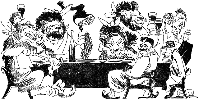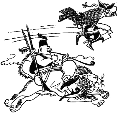 К трибуне подкатился круглый и лысый человек. Он был такой маленький, что из-за трибуны видна была только его пухлая ручка, поднятая вверх, да слышался тонкий, как у комара, голосок. — Я старый охотник! — запищал он. — Я стреляный воробей! Не могу не припомнить странного случая, происшедшего со мной на охоте. Застрелил я на берлоге медведя, смотрю — батюшки — медведь-то стриженый! По всему боку так дорожка машинкой и выстрижена! Чисто так — под нулёвку! Я тогда лешего помянул, а зря. Потому что не леший тут виноват, а лесные мыши! Лежал топтыгин у них на пути, они у него в шерсти дорожку и выстригли. Зубы-то у них не хуже машинки. Так вот… Про что это я? Ах, да, — про Тартарена! Не вышло у вас соврать, господин Тартарен, не вышло. На первый взгляд тоже кажется, что леший, ан разберёшь, — мыши! Ну возьмём, к примеру, пир со львами. Могло быть такое или нет? Я со всей ответственностью отвечаю — могло. Почему я так утверждаю? Потому что у меня есть факты. Сам я со львами — ха-ха! — за одним столом не сидел, а вот знаменитый африканский охотник на львов Джон Хантер сидел. Об этом он сам рассказал в своей книге. Читаю:«Мы поставили стол, накрыли его льняной скатертью и украсили вазой с цветами. В меню входил салат из овощей, фрукты и пиво. Была убита зебра, и её приволокли к столу. По моему приказу убитое животное закрепили на месте, чтобы львы не утащили его из под фокуса аппарата. Три оператора заняли положение в грузовике, а остальные участники уселись за стол. Чтобы привлечь львов, я дал несколько выстрелов из ружья. Вскоре к нам примчалась группа львов. Звери усердно принялись за зебру. Замурлыкали киноаппараты. Рядом шли два пира. При этом львы на нас не обращали ни малейшего внимания».Чувствуете: всё, как у Тартарена! Спрашивается, — зачем было выдавать за выдумку то, что было правдой? Да, дикие львы теперь часто сами бегут на выстрелы в надежде на угощение. Они не боятся автомашин, нередко бегают за ними из любопытства и ложатся отдыхать в тени кузова. В наше время львов запретили убивать, и они перестали бояться человека. И человек перестал бояться львов. Известен и охотник, убивший четырнадцать львов-людоедов: четырнадцать кисточек от их хвостов украшали его шляпу. Звали этого охотника — Аллан Блэк. Другой охотник — Лесли Симпсон — за один год убил триста шестьдесят пять львов — по льву на день! Сам Хантер однажды из засады в одну ночь застрелил восемнадцать львов. Он же убил около тысячи четырёхсот слонов. И было это тогда, когда африканские звери не охранялись в заповедниках и нередко сами нападали на людей. Всё это так, наверное, думаете вы, но поймать льва за хвост — это не то что застрелить его из ружья. О, конечно, не то! Но вот послушайте, что Хантер пишет про негров племени масаи — лучших охотников Африки.