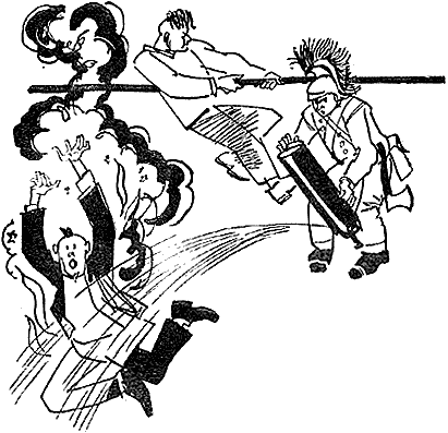 Местные жители очень мучились со своими посевами. Особенно с рисом. Уж очень капризен! Чтобы рис хорошо рос, нужно то добавлять на поля воду, то её спускать. Днём на рисовые поля налетают прожорливые птицы. Ночью поля топчут кабаны. Ни днём ни ночью бедным земледельцам нет покоя. В селениях смолк смех и стихли песни. И рис тогда совсем перестал расти. «Ага!» — смекнул я. И тут же твёрдо решил помочь моим друзьям. Я попросил их отобрать для меня самых плохих музыкантов. Взял я вместо дирижёрской палочки длинную линейку и отправился на поле. Музыканты грянули марш! Я размахивал линейкой. Музыканты не умели играть, а я дирижировать, но главное у нас получилось — шум. Так мы шумели шесть дней и шесть ночей.