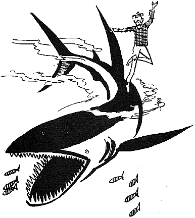 Я плюхнулся в воду и пошёл ко дну. Радости в этом было мало. Не стало мне веселее и после того, как я вынырнул из воды. Вокруг дышал океан… Ни земли на горизонте, ни дымка парохода, ни белого паруса. Одна вода — зелёная и солёная. Так начались мои удивительные приключения на удивительной Планете Чудес. Скоро я увидел, что ко мне приближается большая лодка с чёрным парусом. Я обрадовался и поплыл навстречу. Но это была не лодка. Из воды поднимался огромный чёрный плавник какого-то чудовища, длиною в два телеграфных столба. Акула! Она смотрела на меня зелёными глазами пристально и неподвижно. Я стиснул в руках свой большой нож и окунул голову под воду. На меня медленно надвигалась чёрная раскрытая пасть — огромная, как подводная пещера. Стаи рыб кружили около этой пещеры, то вплывая, то выплывая из неё. Рыбы, видно, служили чудовищу вместо зубочистки: они очищали пасть от остатков пищи. «Так они очистят эту пасть и от моих остатков», — подумал я. Путешествие моё кончалось, не успев начаться. Но акула не проглотила меня. Она под меня поднырнула, и я очутился у неё на спине! Я ухватился за чёрный плавник и поплыл по океану, как в лодке. Акула меня даже не замечала. Она не спеша гребла хвостом и плыла по океану, не опускаясь в глубину. Явь это или сон? Я не переставая щупал жёсткий акулий плавник и щипал себя за ногу.