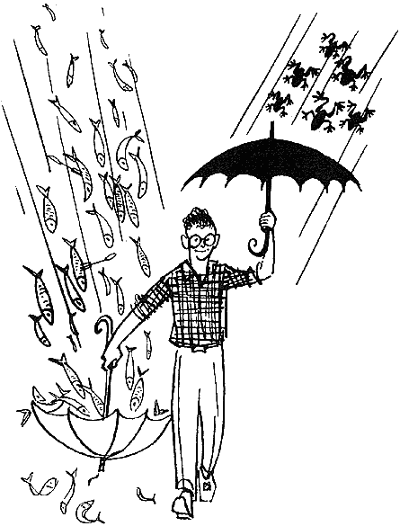 Наши лягушки всегда квакают перед дождём, а местные начали свой лягушачий концерт после дождя. Они, наверное, радовались, что, наконец, попали с неба на землю. Лягушки квакали, а я думал о том, что не плохо бы достать зонт. В лягушачий дождь носил бы его как положено, ручкой вниз, а в дождь селёдочный — ручкой вверх. Очень удобно: и сам сухой, и полный зонт свежих селёдок!