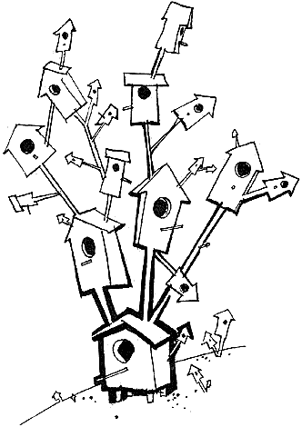 Что вырастет, если посадить арбузное семечко? Вырастет арбуз. А что вырастет, если посадить семечко тыквы? Ну, это смотря где. Если у нас, то тыква вырастет, а если тут, — вырастут скворечники. Самые настоящие скворечники, те, которые по деревьям развешивают и в которых птицы живут. В каждом огороде отведены грядки под скворечники. Как только весной сойдёт снег, землю на грядках взрыхляют и сажают в неё семена. И скоро из земли вылезают зелёные скворечниковые ростки. Ребята поливают и пропалывают грядки. А ростки растут и растут. Вырастают стебли, листья. И наконец появляются цветы. А как только цветы отцветут, так сразу на их месте появляются скворечники. Крошечные, — как спичечный коробок.