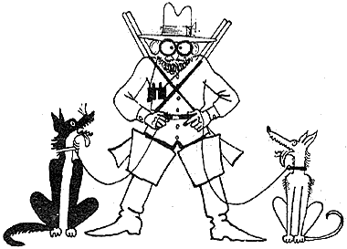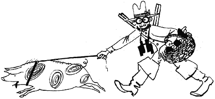 Набив чемоданы, связав узлы, грабители поднимают всё это на плечи и… начинают орать: «Караул!» Орут не своим голосом и так громко, что даже избалованные и ленивые сыщики просыпаются и не спеша, зевая и почёсываясь, бредут к магазину. Там уже толпа любопытных. Воры, плача и сморкаясь, барабанят кулаками в дверь и умоляют поскорее их забрать. Сторож отпирает дверь, сыщики делают шаг вперёд, и воры вешаются к ним на шею. Несчастные торопят поскорее увести их в тюрьму. Сыщики вразвалку бредут к тюрьме; позади на цыпочках поспешают воры. Сторож запирает магазин. Любопытные расходятся. Все улыбаются. Все сыщики тут пузатые: обленились! Зверь-то сам на ловцов бежит!