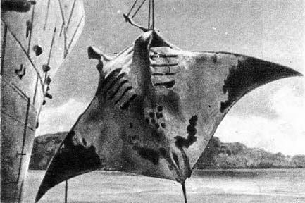 Судно поднимает на борт гигантского ската — манту, рыбу-дьявола.