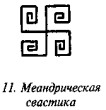 На рис. 8 изображены две разновидности кельтских крестов. Такие кресты ставились в основном на дорогах и кладбищах Ирландии и Шотландии, знаменуя и освящая обычно развилки дорог, и часто были высечены из камня4. Хиггинс в своем «Анакалипсисе» (Лондон, 1836, т. 1, с. 230), книге дорогой и редкой, энциклопедически задуманной, пишет касательно истории креста, что официальный титул религиозного главы Тибета — ламы — происходит от тибетского слова, обозначающего крест5. Эту точку зрения разделяет и Дэйвенпорт в «Афродизиаках». Из многих форм креста крест-свастика является древнейшим. Несмотря на многие попытки выяснить его происхождение, оно до сих пор остаётся нам неизвестным. Эмблема эта появилась в доисторические времена и может быть описана следующим образом: ветви6 обычной свастики (рис. 9) равновелики, одинаковой толщины, пересекаются под прямым углом, изгибаются под прямым углом на середине своей длины, причём загибы также одинаковой длины, толщины и формы. Особенностью свастики является то, что все загибы «смотрят» в одну сторону, либо по часовой стрелке, либо против неё. Профессор Макс Мюллер применяет для разнозакрученной свастики различные термины, считая свастику с загибом по часовой стрелке истинною свастикой, а с загибом против часовой стрелки «суавастикой» (рис. 9, 10), не удосужившись объяснить, откуда он берёт такое курьёзное наименование, которое автор настоящей книги нигде не смог отыскать, кроме как у Бюрнуфа, — что ставит под сомнение древность приводимого им «имени». Профессор Гудъеар именует меандром ту форму свастики, которая загибается спиралями на каждом завитке (рис. 11).