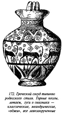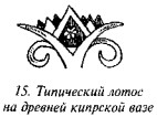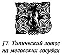 Он показывает перенос мотива лотоса в Грецию, его использование в украшении раскрашенных сосудов на Кипре, Родосе и Мелосе (рис. 15–17). Шантр (Chantre, «Age du Bronze», часть II, с. 301) отмечает присутствие спиралей, схожих с теми, которые мы видим на нашем рисунке 17, в памятниках «террамаре» Северной Италии и в дельте Дуная, а рисунок 17, как он говорит, является декоративным мотивом, очень популярным в ту пору в этой области доисторической Европы. Он ссылается на статью «Notes sur les torques ou ornaments spirals» («Matériaux pour l’Histoire Primitive et Naturelle de l’Homme», 3-éme ser., VIII, c. 6.)