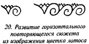 По мнению профессора Гудъеара («Grammar of the Lotus», табл. 8, с. 81) эти закрученные крайние лепестки были утрированы и позднее превратились в спирали. Прикрывая часть соседнего цветка, эти спирали-завитки образовывали стандартный повторяющийся узор, расположенный в видеорнаментальных лент (рис. 20). Будучи продолжены с различных боков, они могли покрывать типизированным орнаментом большие площади (модель на рис. 21). Один из путей, которым шло дальнейшее развитие, было замыкание завитков и устранение соединительного элемента (вертикально направленных лепестков), в результате чего получались концентрические круги, столь часто встречающиеся нам. Несколько образцов египетских скарабеев, по которым видна эволюция мотива концентрических кругов, мы показываем на рис. 22–24. По этой же теории происходила так же геометризация (заострение углов) этих спиральных завитков, результатом чего является греческая модель, изображённая на рис. 25.