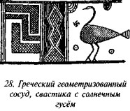 Прямоугольный орнамент из пересекающихся линий16 (англ, fret) остаётся только продублировать, и получится свастика, как показано на рис. 27–28. («Grammar of the Lotus», с. 353). Этот же автор утверждает, что древнейшие датируемые образцы такой не серийно изображённой завивки (scroll) относятся к пятой египетской династии, а лотоса и спирали — к эпохе одиннадцатой династии. Спираль с рис. 19 датируется двенадцатой династией. Целая глава этой книги посвящена обсуждению знака свастики. На с. 352–353 автор пишет: «В археологии мало столь легко доказуемых гипотез, как та, что свастика произошла из меандра, будучи, так сказать, его обломком — доказательством тому служат древнегреческие геометризованные вазы.