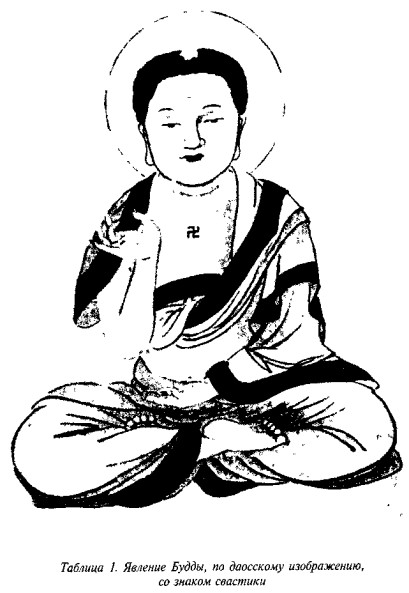 — для луны, отдельная окружность — для звезды и пр. Эти «иероглифы» активно использовались в стилизованном под древность рисуночном письме, а знак «свастика в круге», кроме того, хорошо задокументирован в древних надписях на камне, сохранившихся до настоящего времени (оригинал этого текста на китайском языке смотри в углу рисунка на табл. 2).