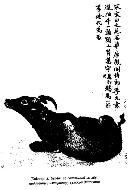 Сун Пай из династии Сун упоминает о приношении танского чиновника Ли Юэн-су своему императору живого буйвола со свастикой на лбу, за что император одарил его царственным скакуном (табл. 5).